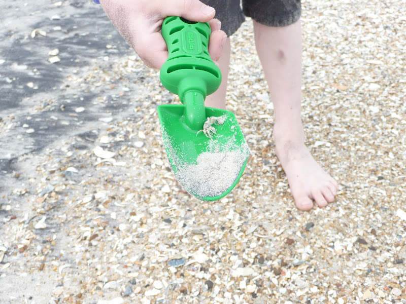 | Elijah and Sam caught a sand crab while digging in the sand. The poor crab was not very happy about it. |